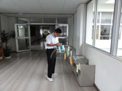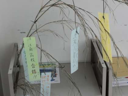 3年生の渡りには、ささが飾られています。短冊も用意されていて、生徒たちは思い思いの願い事を書いてはぶら下げていっています。