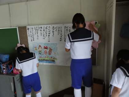 外掃除ができないので、掲示物の張り替えの手伝いです。