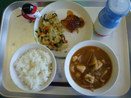 【今日の献立】 ・イカの照り焼き ・味噌汁 ・昆布和え ・ご飯 ・牛乳