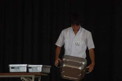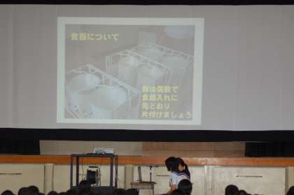 扶桑町共同調理場が新しくなり,それに伴い,食器も変わります。そこで,給食委員会の生徒が栄養士前田さんから教えていただいた新しい食器の使用方法について,全校生徒に説明をしました。