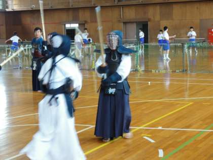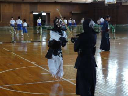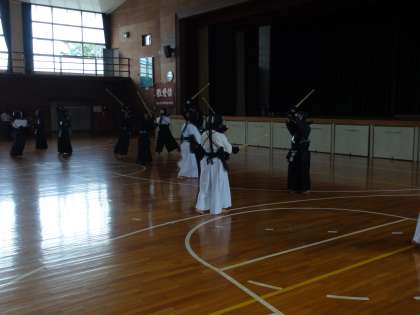 剣道部は男女合同で練習をしています。今日は基本の動きを確認していました。