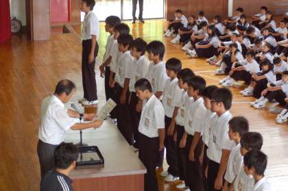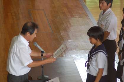 8月1日出校日に,全校集会を行いました。県大会女子100m2位となり東海大会出場を決めた菅嶋さんを皮切りに,陸上,水泳,卓球,サッカー,ハンド,吹奏楽の表彰伝達を行いました。