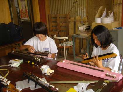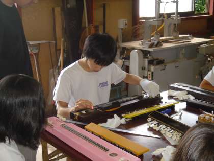 大正琴を作り,チューニングをしています。