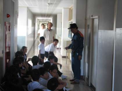 理科室に煙(体には無害です)をたきしめ暗幕もしめて、その中を通り抜けます。もしも火災に巻き込まれて、煙の中を避難しなければいけなくなったときの体験です。