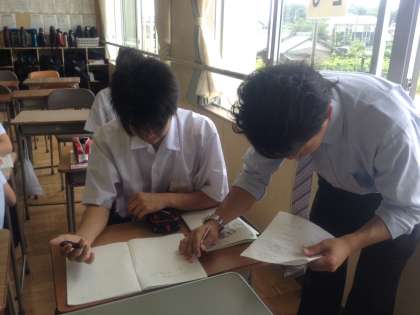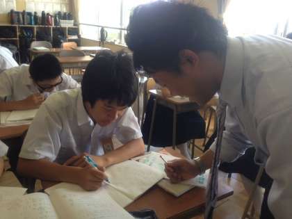テスト勉強で、頑張る2年5組の生徒に丸をつけながら、優しく分からない所を教えてくれています。