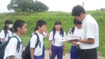 2組のグループです、無事に緑地公園に到着し、先生に報告をしています。