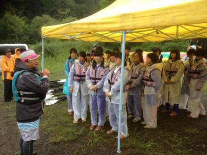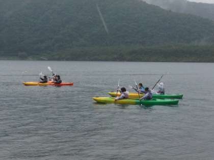 雨天のため、パラグライダーからカヌー体験に代わりました。富士五湖の一つ、西湖(さいこ)にて、インストラクターの方に教えていただきながら、体験を行っています。