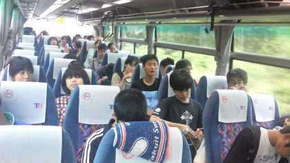 帰路のバスの中です。自然体験で冷えた身体をバーベキューで暖め、元気を回復中。青木ヶ原、精進湖、本栖湖、朝霧高原と富士山麓の名所を巡りながら新幹線新富士駅を目指します。