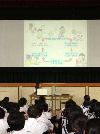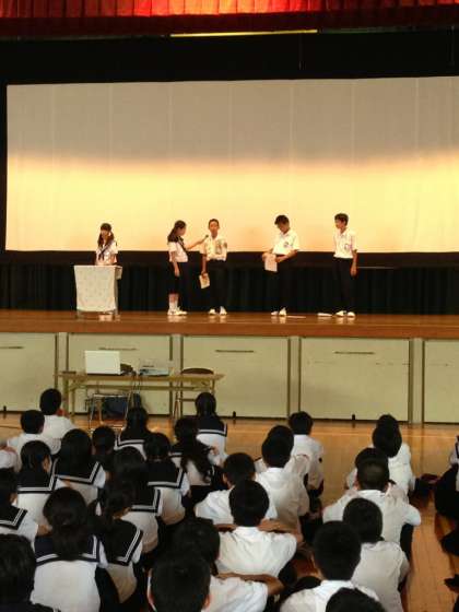 本日の6時間目に、1年生は食育に関する集会を行いました。給食委員会による劇のあと、栄養教諭の前田先生のお話を伺いました。暑い夏を乗り切るためにどんな食事をとったらよいか学びました。もうすぐ迎える夏休みの食生活に生かしていきたいです。