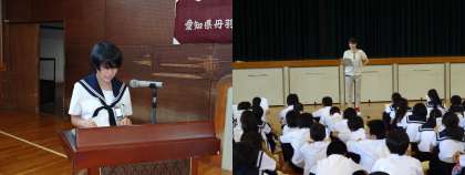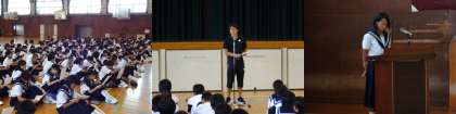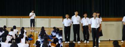 6限に司会・運営を学級委員が行っての学年集会を行いました。それぞれ先生方から,夏休みの学習について,生活面,部活動についての話がありました。その後,各クラス学級委員がクラスの前期前半の反省と後半の目標の話をしました。