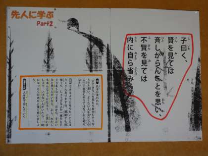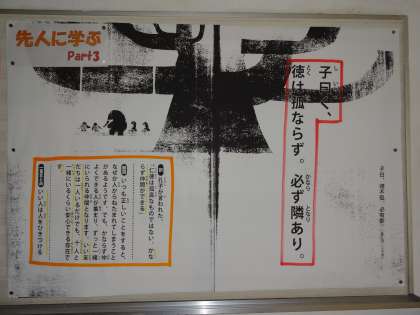 2つ目は,「子曰く,徳は孤ならず,必ず隣あり。」です。意味は,「いつも正しいことをしていると,ねたまれてしまうようなこともある。しかし,必ず自分のことを認めてくれる仲間があらわれます。よい友だちは一人いるだけでも安心できる存在である。」です。