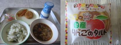 今日の給食 公開日 2013/11/20 更新日 2013/11/20 学校の様子 11月20日(水)の給食です。 o わかめごはん o きのこ汁 o 愛知県産コロッケ o 守口漬け o 牛乳 o りんごのタルト いいね(0)