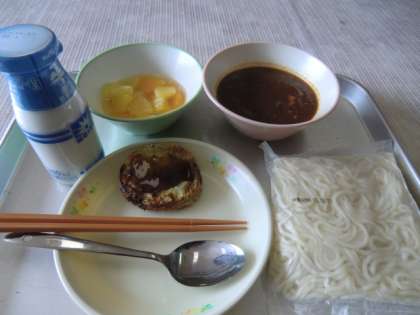11月21日(木)の給食 o ソフトめん肉みそかけ o ねぎ焼き o 牛乳 o フルーツミックス