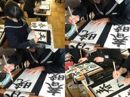 競書会の様子。3年生は「春暁の誓」という字を書いています。一筆一筆丁寧に。中には正座をして真剣に取り組む姿も見られました。