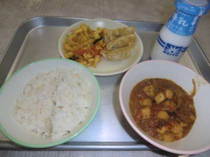 1月8日(水)の給食です。 o 麦ごはん o マーボー豆腐 o 揚げぎょうざ o 春雨サラダ o 牛乳