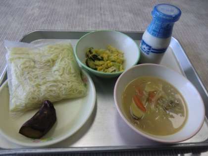 1月9日(木)の給食です。 o とんこつラーメン o バンバンジーサラダ o やきいも o 牛乳