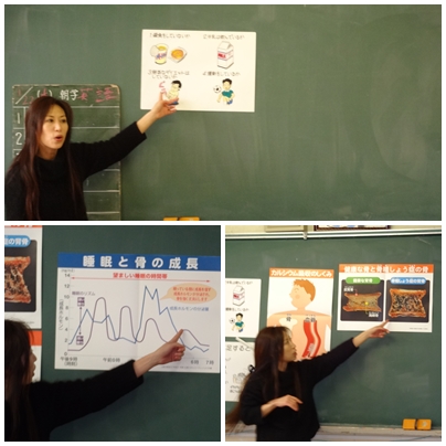 その後,カルシウムをとらないと骨粗鬆症になる話をされました。骨粗鬆症を防ぐにも,睡眠と運動が大切であることを話されました。