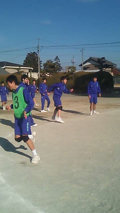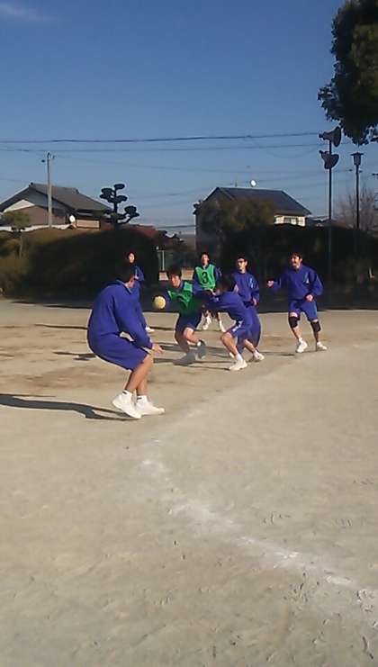 男子の体育はハンドボールです。ロングパスのテストの後、試合が始まりました。ハンドボール部が活躍中です。