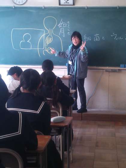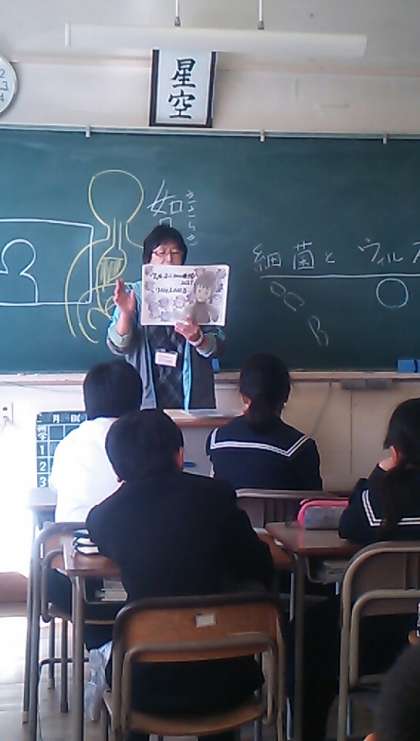 1年4組の2時間目は、養護教諭の穴沢先生が細菌とウィルス・風邪とインフルエンザの違いを紙芝居を使用して分かりやすく解説しました。免疫をつけるためには、生活習慣がいかに大切かを考えさせられました。また、予防について改めて知る機会になりました。