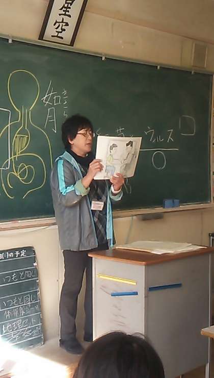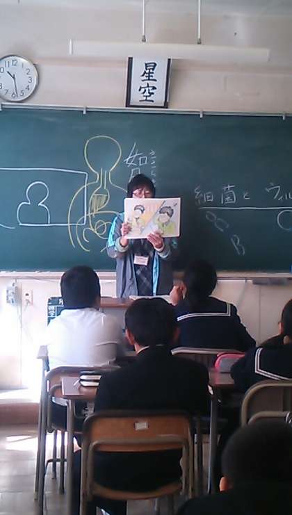 おまけに1年4組のリクエストの生活習慣についての紙芝居も紹介しました。ご飯を充分に食べずにお菓子ばかり食べ、ネガティブになってストレスを溜める太郎さんが、大人になって体がボロボロになるという内容でした。