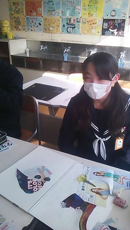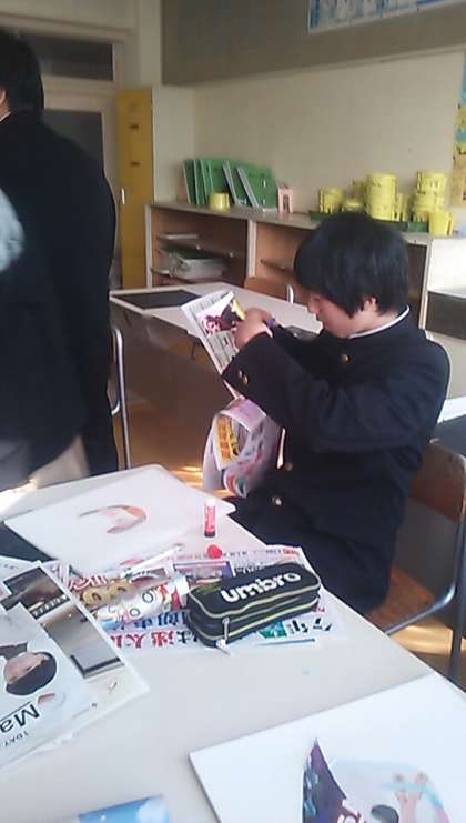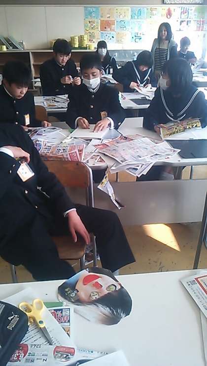 2年生の美術は、コラージュの制作にとりかかっています。持参した広告や雑誌を切り抜いて、人の顔を作ります。普段あまり見ない広告を見て、イメージを膨らませます。