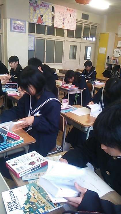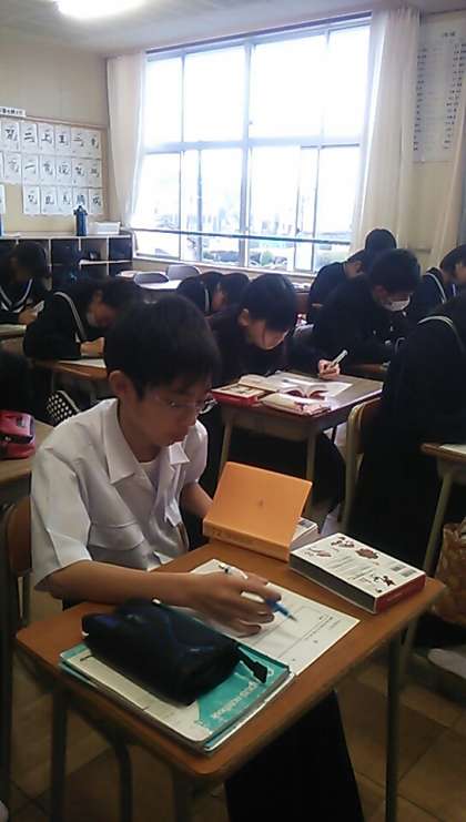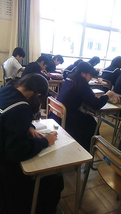 2年生の英語の授業では、5行詩を作っています。1行目には話題を1語で、2行目には2語加えて、3行目は3語で描写、4行目は気持ちを4語で、5行目は話題を1語でまとめる、という形式です。10分間で辞書を片手に、英語の詩に挑戦しています。