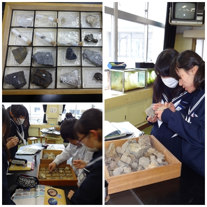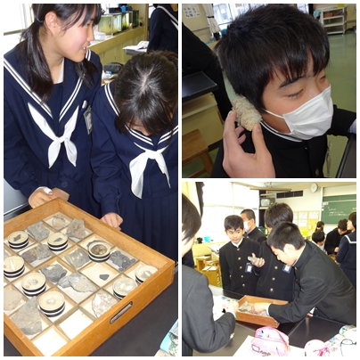 1年生の理科の授業で,化石について学習しました。多くの化石を見て,「そのままの形で残っていてすごい」などの感想がありました。中には貝の化石を耳に当てている生徒もいました。昔の音は聞こえたでしょうか?