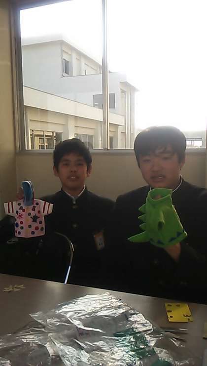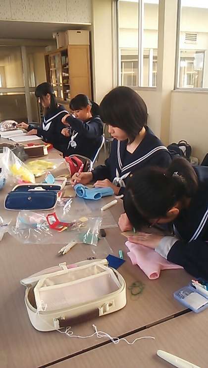 ST後、家庭科の居残りでミニチュアパーカーを完成させます。バックに背びれつけたり、模様をつけたり、それぞれ工夫が光ります。石原先生の指導のもと、着々と作業が進みます。