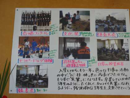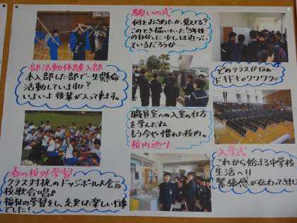 1年生の掲示板を新しくしました。1年間の出来事を振り返る掲示物です。この1年の行事などを通して,少しずつですが,成長してきました。修了式まであと8日です。今のクラスでよい思い出をいっぱい作ってください。