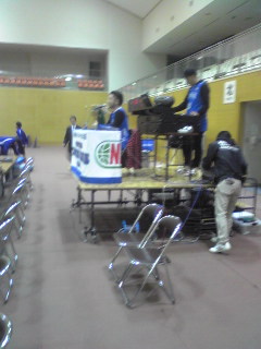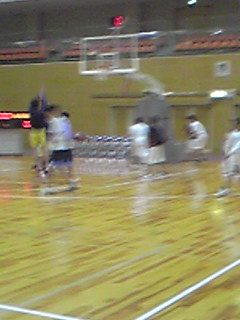 名古屋東スポーツセンターでNBDLの前座試合、尾北選抜として、酒井君と武内君が参加しています。今、選手紹介が終わり、アップ中です。間もなく試合開始です。