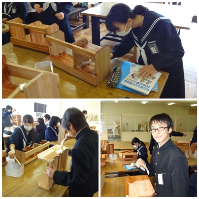 一年生の技術の時間には,本棚を作っていました。多くの生徒がニスを塗って仕上げをしていました。