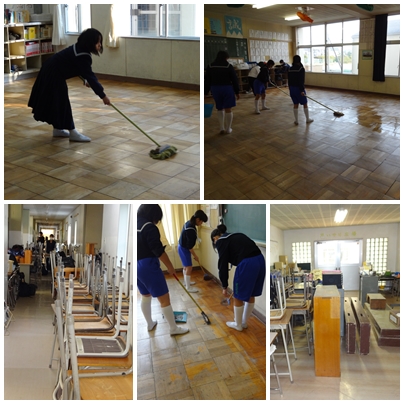 今日のST後,美化委員を中心の各教室の油引きを行いました。教室に置いてある物をすべて廊下に出し,きれいに掃除をしてから,モップで油引きをします。1年間の教室へのお礼込めて行っていました。きれいな教室で新年度を迎えられそうです。