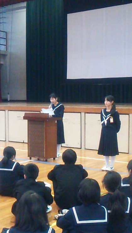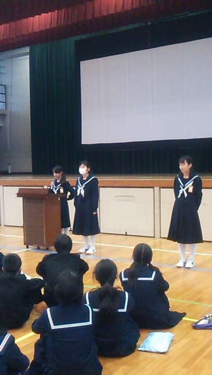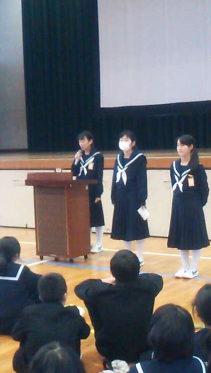 5時間目は2年生の学年集会でした。学習・修学旅行について先生から話を聞いたあと、各クラスの代表1名が意見発表しました。1組はクラスの思い出を感謝の気持ちとともに話しました。2組は主に自然教室のクラススタンツの木村先生について話しました。3組は新たな一歩を踏み出す勇気について話しました。