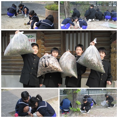 アダプトプログラムとは、公共の場所を我が子のように愛情をもって面倒をみることをいいます。扶桑中では、学校のすぐ東にある柏森北公園の清掃活動を行っています。実施するようになってから、5年以上経過しているとのこと。1年生もその仲間入りです。一生懸命取り組んだ結果、4袋の草や落ち葉を集めることができました。