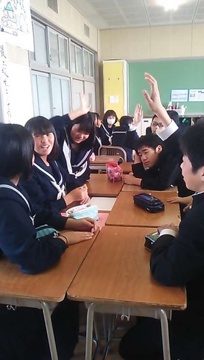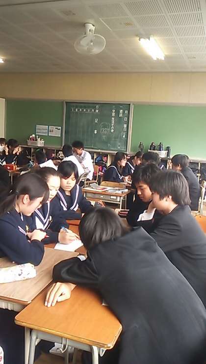総合の時間に、修学旅行の学級別分散の行き先を班ごとに相談して決めます。下調べしてきた生徒もいて、盛り上がっています。