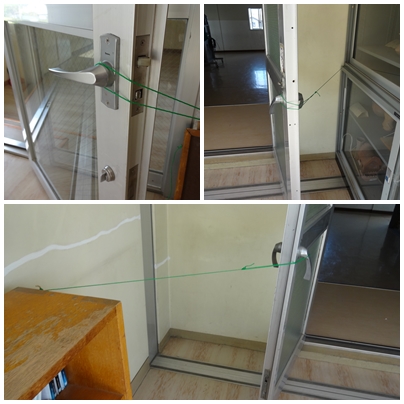 2年生の渡り廊下は,よく風が通ります。最近,風が強いため,渡り廊下の扉が風に押されて閉まってしまうことがありました。ロープで扉を引っ張るものをつけました。これで風によって閉まることがなくなり,安全に通行することができます。