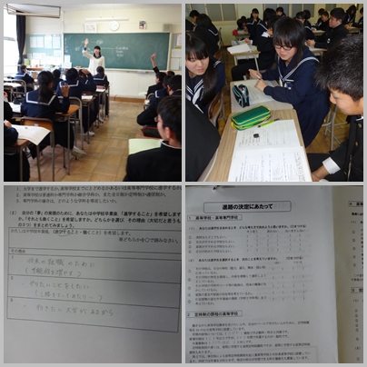 今日の2年生の総合の時間には,来年の進路に向けて学習しました。今の自分は,進学したいのか就職したいのかを考え,進学の場合には,全日制の高等学校や定時制の高等学校,専修学校,通信制の学校などがあるということを知りました。