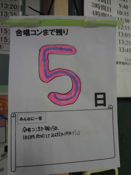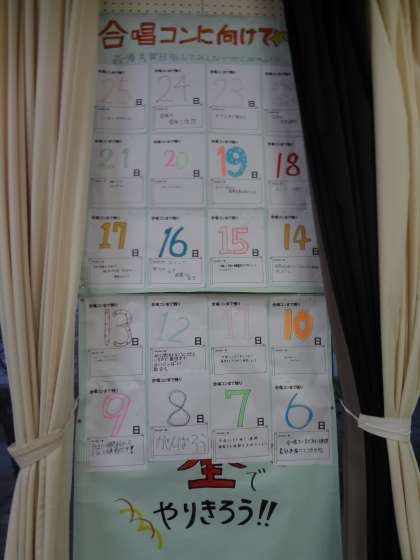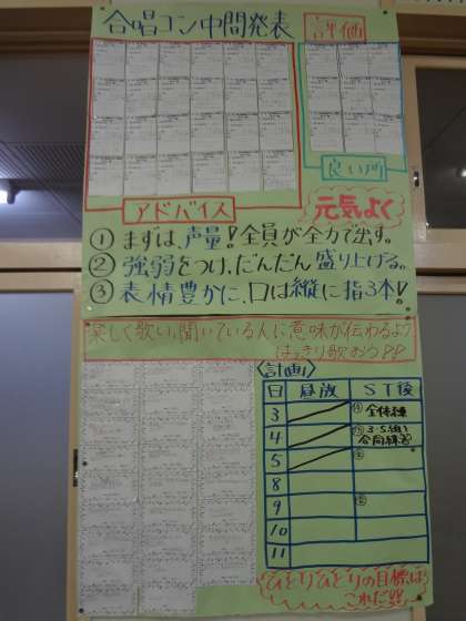1年2組では,合唱コンクールに向けて日々合唱練習に取り組んでいます。教室には,先日の中間発表で他クラスからもらったアドバイスやひとりひとりの目標などが掲示してあります。合唱コンクールまで,あと5日!緊張感をもって練習に取り組みましょう。