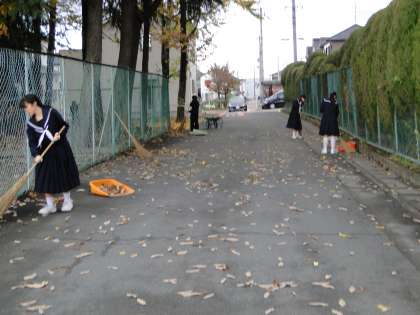 環境・緑化委員会では、朝の常時活動として花の水やりや落ち葉はきなどを交代で行っています。花の植え替えが終わったので、この時期は落ち葉はきが大変です。多いときは、正門へ続く道(写真)が銀杏の葉で覆われます。