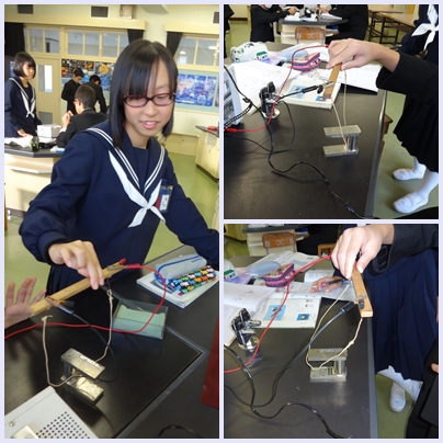 2年2組の理科では,電流が磁界の中で受ける力について実験をしました。写真のように電流が流れている銅線に磁石を近づけると,銅線が動きます。電流の向きや磁界の向きによって銅線の受ける力が変わります。これを簡単に表したものが「フレミングの左手の法則」です。