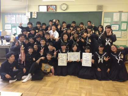3年4組 公開日 2014/12/11 更新日 2014/12/11 3年生 合唱コンクールで3年4組が最優秀賞と生徒会賞をW受賞することができました。生徒たちのすばらしい合唱が聴けてよかったです。次は卒業式でしっかり歌えるように練習していきます! いいね(0)