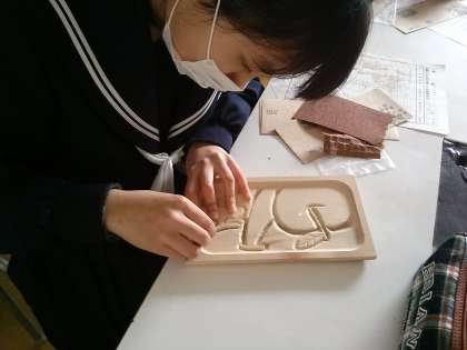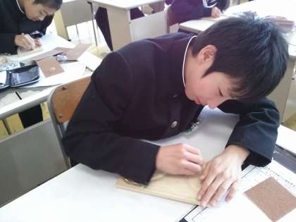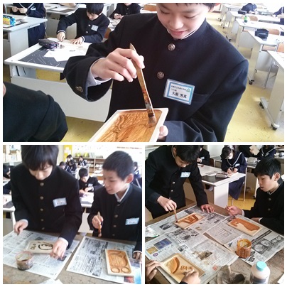 1年1組,3組,4組の美術の授業の様子です。1,3組ではヤスリがけが終わった子からニス塗りをしています。ニスは5種類の色の中から自由に選ぶことができますが,ほとんどの人が「メープル」を選んでいます。