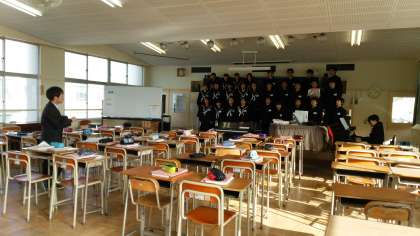 音楽の授業では、一年生は今「流れ行く雲を見つめて」を練習しています。昨日は特別ゲストで滝先生がみにきました!