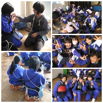 多くの生徒が剣道に取り組むのは初めてで,剣道の防具を着けることに興味津々の様子でした。慣れない手つきながら,しっかりと話を聞き,一生懸命がんばる姿が多く見られました。