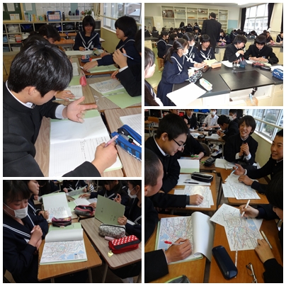 今日の総合は,修学旅行2日目に行う班別研修の班ごとに分かれて,係分担や体験場所の最寄り駅などを確認しました。