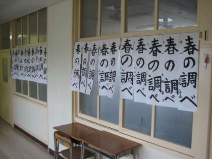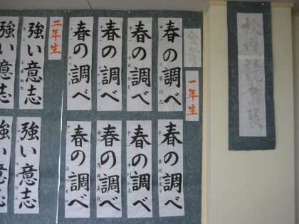 1月はじめに学校で行った競書会の作品が渡りや廊下にずらりと並びました。
