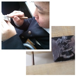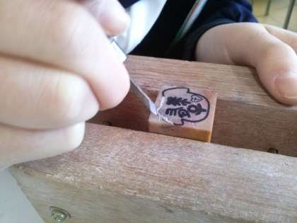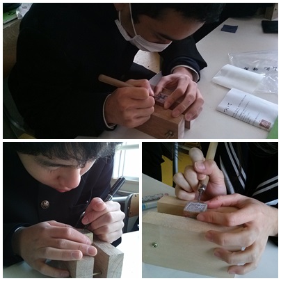 1〜3時間目の美術の授業は3年生の卒業制作として篆刻をやりました。陰刻にするか,陽刻にするかは自分で選ぶことができますが,他の人には真似できないような難しいデザインにチャレンジしている人もいます。