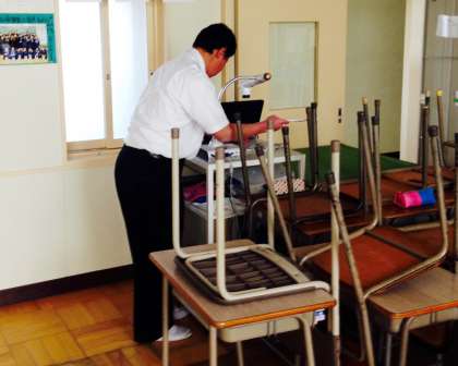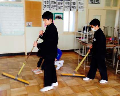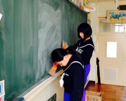 ほうきで丁寧に床を掃く生徒,黒板をまっさらに磨く生徒,