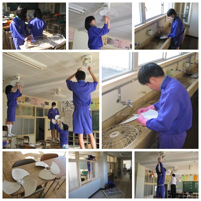 1年生のフロアでは,各教室の扇風機の分解してすみずみまで掃除をしたり,窓枠を外してガラスを拭いたりと,普段なかなかできないところまでしっかりと清掃活動をしてくれました。