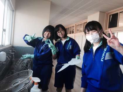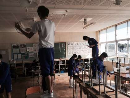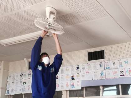 扇風機の羽根を外して洗いました。高いところは男子にお任せです。